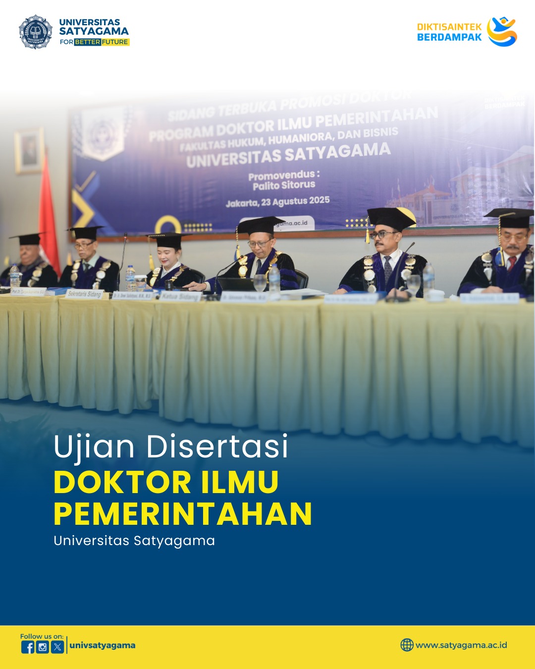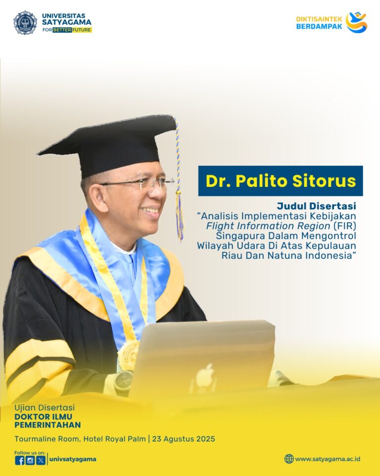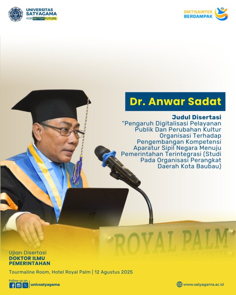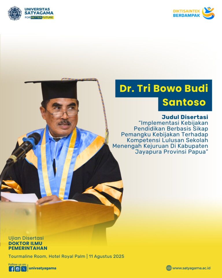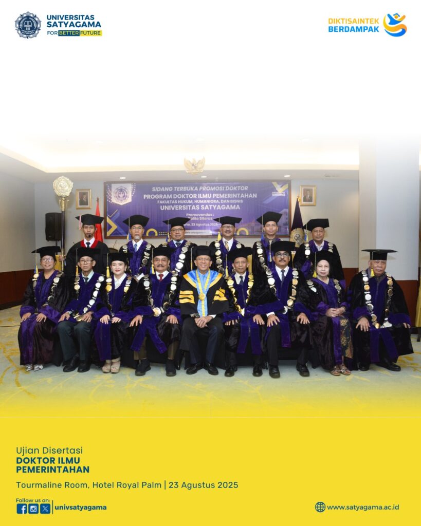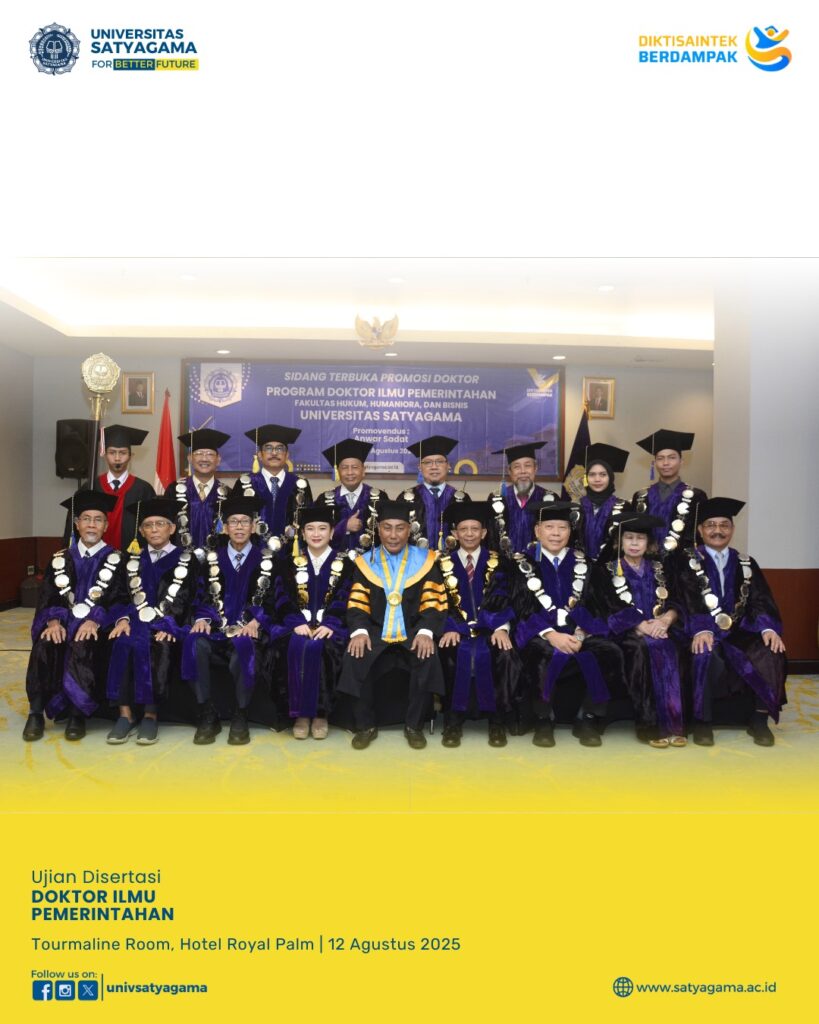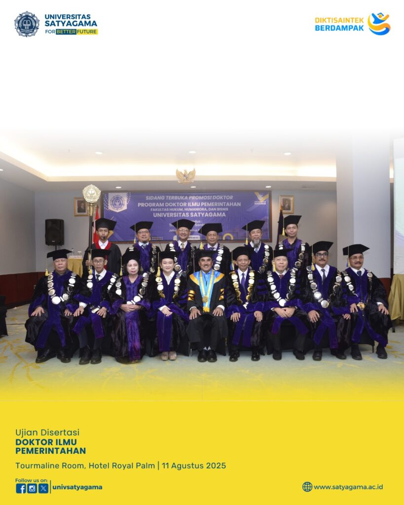 Pada bulan Agustus 2025, Universitas Satyagama telah sukses menyelenggarakan Sidang Ujian Disertasi Doktor Ilmu Pemerintahan yang bertempat di Tourmaline Room, Hotel Royal Palm.